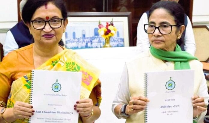 রাজ্যের অন্তর্বর্তী বাজেট হাতে (বাঁ দিকে) অর্থ দফতরের প্রতিমন্ত্রী চন্দ্রিমা ভট্টাচার্য এবং মুখ্যমন্ত্রী মমতা বন্দ্যোপাধ্যায় (ডান দিকে)। ছবি– সংগৃহীত।